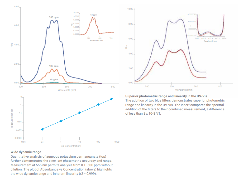 借助参比光束衰减器,可测量吸光度超过8.0 Abs的样品;使用PbSmart的近红外检测器将Cary卓越的检测性能扩展到175~3300 nmWinUV软件-模块化的软件具有强大的数据分析、处理与报告导出功能;用于材料研究的多功能附件包括镜面反射和漫反射附件;可变带宽(最小可达0.01 nm)实现光谱分辨率的优化;带LockDown机械装置的大样品室可保证快速地更换和定位附件,帮助获得高重现性的结果;Schwarzchild聚光系统保证了高光通量,可以在低透过率下获得更高的准确度;铸铝的避震隔离系统和Littrow双单色器设计最大程度减少噪音和杂散光;参比光束衰减到更好地与样品吸光度匹配的程度,扩展了仪器的线性范围;氮气吹扫-可以分别吹扫单色器和样品室。