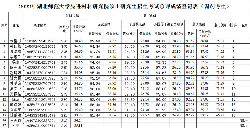 根据教育部关于印发《2022年全国硕士研究生招生工作管理规定》(教学函〔2021〕2号)的通知等文件精神,现对先进材料研究院2022年硕士研究生复试成绩进行公示,详见附件。公示时间为2022年4月8日-2022年4月15日。公示期间,考生若有疑问,可向我校有关部门反映。