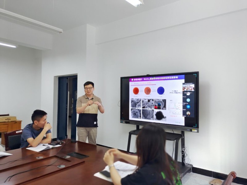 接着,我院马祯和熊东彬两位博士以学术报告的形式与参加活动的师生开展学术交流。马祯博士以《中子散射技术及其在量子磁体中的应用》为报告题目,详细介绍了中子散射技术的发展历程与国内外大型中子源建设和相关中子谱仪,并以量子自旋液体为例,简要介绍其在当前凝聚态物理学得前沿方向—量子磁体研究中的应用。熊东彬博士以《二维纳米材料的结构调控与电化学储能》为报告题目,介绍了在“双碳”战略背景下,发展电化学储能技术对缓解能源危机和环境污染的重要性,并以二维MXene材料和MoSe2材料在锂硫电池中的应用研究为例,阐明通过材料结构调控促进电化学储能性能的提升的作用机制。报告结束后,两位博士与在场师生就相关问题进行了深入的讨论。最后,刘俊明教授也对两位博士的报告给出点评,并提出了诸多宝贵的意见。