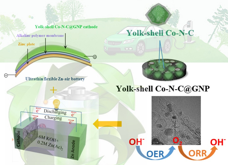 其后,刘易斯副教授成功合成了三维石墨烯纳米袋 (GNP) 材料,并以此为导电基底,装载蛋黄-壳结构双MOFs (ZIF-8@ZIF-67),通过高温热处理原位构筑具有三维多孔蛋黄-壳结构的Co–N–C@GNP复合材料。该材料在(柔性)锌空气电池中表现出优异的性能。该工作利用同步辐射、原位拉曼等技术,明确了活性位点的结构,研究了材料的催化反应机理,为设计和制备可充电金属-空气电池中的正极材料提供了理论指导。相关研究成果以“Hierarchical Porous Yolk-Shell Co-N-C Nanocatalysts Encaged in Graphene Nanopockets for High-Performance Zn-Air Battery”为题发表。文章链接:https://www.sciopen.com/article/10.1007/s12274-023-5593-2。