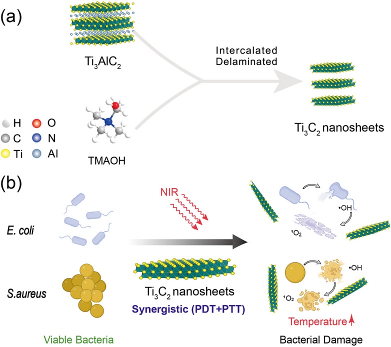 鉴于此,宣琎楠博士基于四甲基氢氧化铵(TMAOH)嵌入与剥离策略,成功制备了具有良好生物相容性以及光热-光动力协同抗菌活性的二维Ti3C2纳米片。与传统的HF或原位HF(HCl+LiF)剥离的Ti3C2纳米片相比,此策略制备的Ti3C2纳米片表现出更强光热-光动力协同抗菌效率。进一步深入研究表明,此Ti3C2纳米片抗菌机制多样化,不仅对靶细菌黏附能力强,而且在近红外光NIR照射下会升高温度促进活性氧(ROS)生成从而协同破坏细菌膜结构,导致细菌内容物泄漏,增强抗菌活性。因此,基于TMAOH的嵌入与剥离策略制备的Ti3C2纳米片作为一种有效的二维广谱抗菌纳米材料展示出巨大的应用潜力。