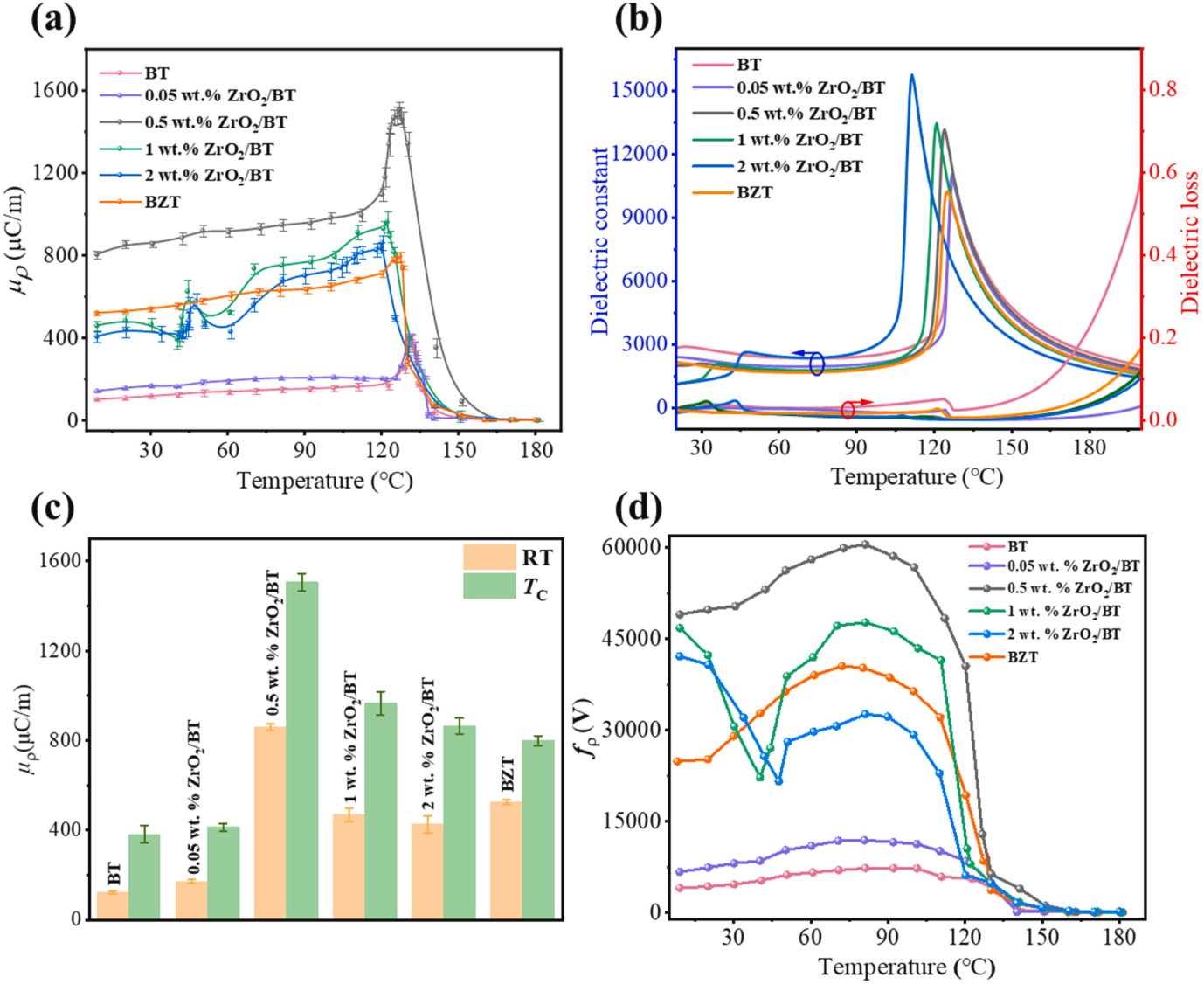 挠曲电效应是一种极化响应与应变梯度或者应力与电场梯度的耦合效应,不受材料晶体结构限制,可以产生类似压电效应的物理现象,甚至比压电效应的应用更加广泛。当前,铅基压电陶瓷的压电效应和温度稳定性虽然总体上优于无铅压电陶瓷,但是出于环境友好型考虑,本团队广泛开展BaTiO3陶瓷的挠曲电效应(类压电效应)研究。巧妙引入ZrO2粉体,构造晶界组分调制的BaTiO3复合陶瓷,实现了组分调制挠曲电增强效应。结果表明,最优组分时,室温的挠曲电系数高达800μC/m,居里温度(~127 ℃)附近的挠曲电系数超过1500μC/m,分别是BaTiO3陶瓷的6.7倍和4倍。此外,在较宽温度范围内,仍然保持高挠曲电系数。这种由于组分不均匀性产生的应变梯度,引起陶瓷内部产生挠曲电极性,进而增强陶瓷挠曲电系数的实践为从铁电陶瓷中获得大挠曲电响应提供了一种有效策略。