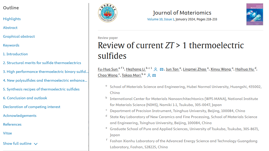 近日,我院孙富华副教授团队应邀在Journal of Materiomics第10卷第1期发表了题目为“Review of current ZT > 1 thermoelectric sulfides”的综述论文。《Journal of Materiomics》为中科院一区TOP期刊,影响因子9.4,入选首批中国科技期刊卓越行动计划,注重报道以材料设计、制备、表征及应用技术为主线的系统性前沿研究成果。