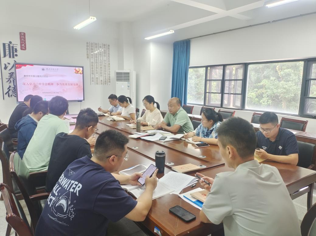 在专题学习环节,刘易斯同志领学了中国共产党第二十届中央委员会第三次全体会议公报主要内容;曹涛同志领学了中国共产党湖北省第十二届委员会第七次全体会议公报主要内容;曹艺同志领学了中共黄石市委十四届五次全体会议精神以及习近平总书记关于“铸牢中华民族共同体意识、推进新时代党的民族工作高质量发展”讲话精神。随后,刘易斯同志领学了深入学习领会习近平总书记关于加强党的纪律建设的重要论述,并对我院教师党支部党纪学习教育情况进行了总结,强调纪律教育要经常化、长效化,进一步推动全院广大党员干部学纪、知纪、明纪、守纪。