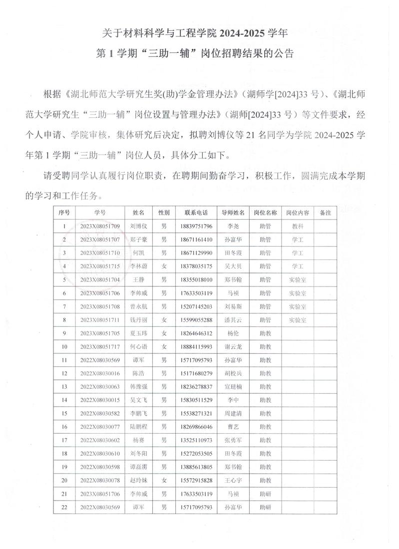 关于太阳成集团tyc334552024-2025学年第1学期“三助一辅”岗位招聘结果的公告