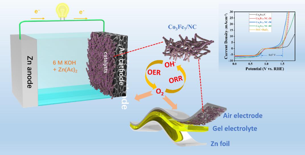 刘易斯博士团队针对 Me/Nx/C电催化剂活性位点的高密度高分散制备难题,利用MIL-88B独特的空腔-孔结构优势,作为主体模板封装金属前驱体CoPP(客体分子),不仅能利用孔道有效孤立金属前驱体以避免热解过程中金属团聚和快速氧化,并且金属客体在主体腔内也能起到支撑孔道结构的作用,防止热解导致结构坍塌。制备得到的三维多孔氮掺杂碳限域Co3Fe7纳米合金颗粒复合材料(Co3Fe7/NC)具有高密度高分散双金属原子(FeN2-CoN4)活性位点,提高了催化剂的本征双功能催化(ORR与OER)活性(其ORR半波电位达0.86 V,在10 mA cm⁻²时的 OER过电位仅为1.53 V)。通过理论计算与原位拉曼表征相结合共同证实了其氧电催化机制。此外,Co3Fe7/NC作为金属空气电池阴极催化剂,表现出高比容量和超长(> 1400 h)的循环稳定性,并且在柔性锌空气电池中也展现出优异的柔韧性能。这项工作为设计高效的Me/Nx/C催化剂开辟了新的机遇,这可能推动燃料电池/金属空气电池产业的发展。