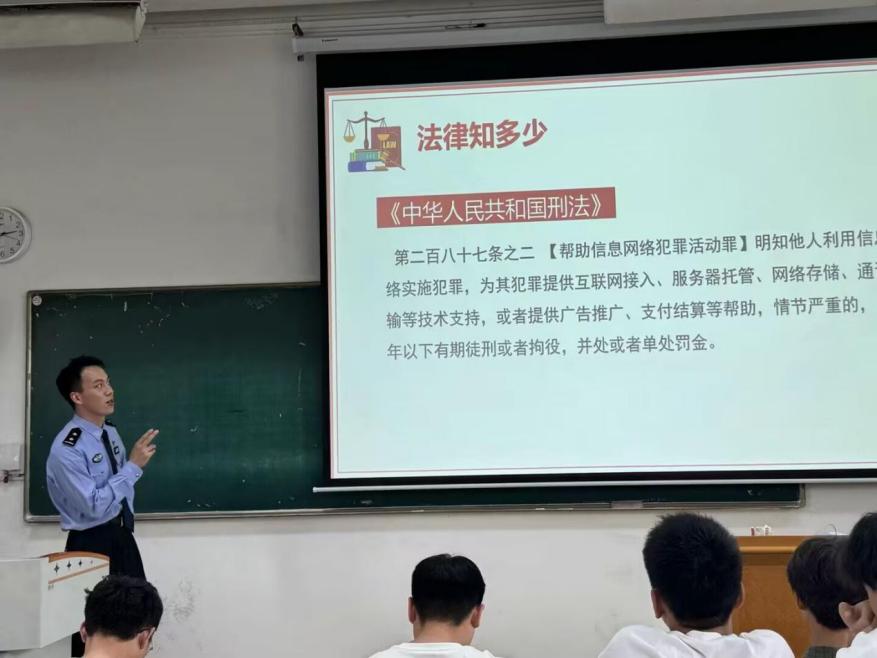 讲座伊始,徐梁警官结合自身丰富的办案经验,通过真实案例深入浅出地剖析了当前电信网络诈骗的常见类型和作案手段。从“刷单返利”到“网络贷款”“假冒熟人借钱”等,警官详细讲解了诈骗分子如何利用人们的好奇、贪念等心理实施诈骗,生动还原了诈骗过程,让同学们深刻认识到电信网络诈骗的隐蔽性和危害性。
