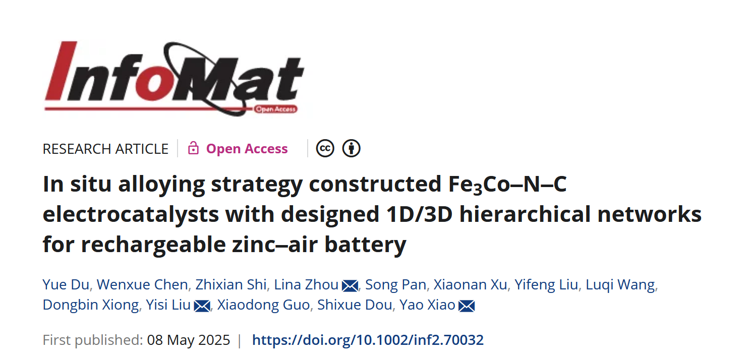 Yue Du, Wenxue Chen, Zhixian Shi, Lina Zhou *, Song Pan, Xiaonan Xu, Yifeng Liu, Luqi Wang, Dongbin Xiong, Yisi Liu *, Xiaodong Guo, Shixue Dou, and Yao Xiao *. In-situ alloying strategy constructed Fe3Co-N-C electrocatalysts with designed 1D/3D hierarchical networks for rechargeable zinc-air battery, InfoMat, 2025, e70032. DOI:10.1002/inf2.70032