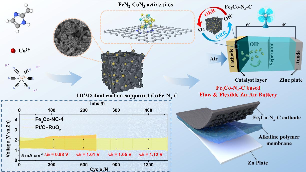 二次锌-空气电池(RZABs)作为一种前景广阔的能量转换设备,近年受到了研究人员的广泛关注。然而,在整个充放电循环过程中,空气阴极上发生的氧还原反应(ORR)和氧析出反应(OER)的动力学过程缓慢,这给研究带来了巨大挑战。因此,开发具有优异性能和循环稳定性的双功能电催化剂至关重要。针对上述问题,杜岳博士所在的先进储能与催化研究小组,通过高效的化学诱导自组装策略构建了一种新型配位聚合物前驱体,并原位生长形成了1D/3D双碳负载的铁钴氮碳化物(Fe3Co-NC)。表征与理论计算结果揭示,FeN2-CoN3活性位点与1D/3D分级网络的协同效应显著提升了该材料在碱性电解质中的ORR/OER双功能催化活性。其中,所制备的Fe3Co-NC-4表现出卓越的半波电位(0.88 V),并在10 mA cm-2电流密度下实现了1.67 V的过电位。此外,所组装的RZAB峰值功率密度达到182.4 mW cm-2,且在400小时恒流充放电循环后仍能维持约1.1 V的输出电压。该研究为高性能双功能电催化剂的低成本制备提供了一种新策略。