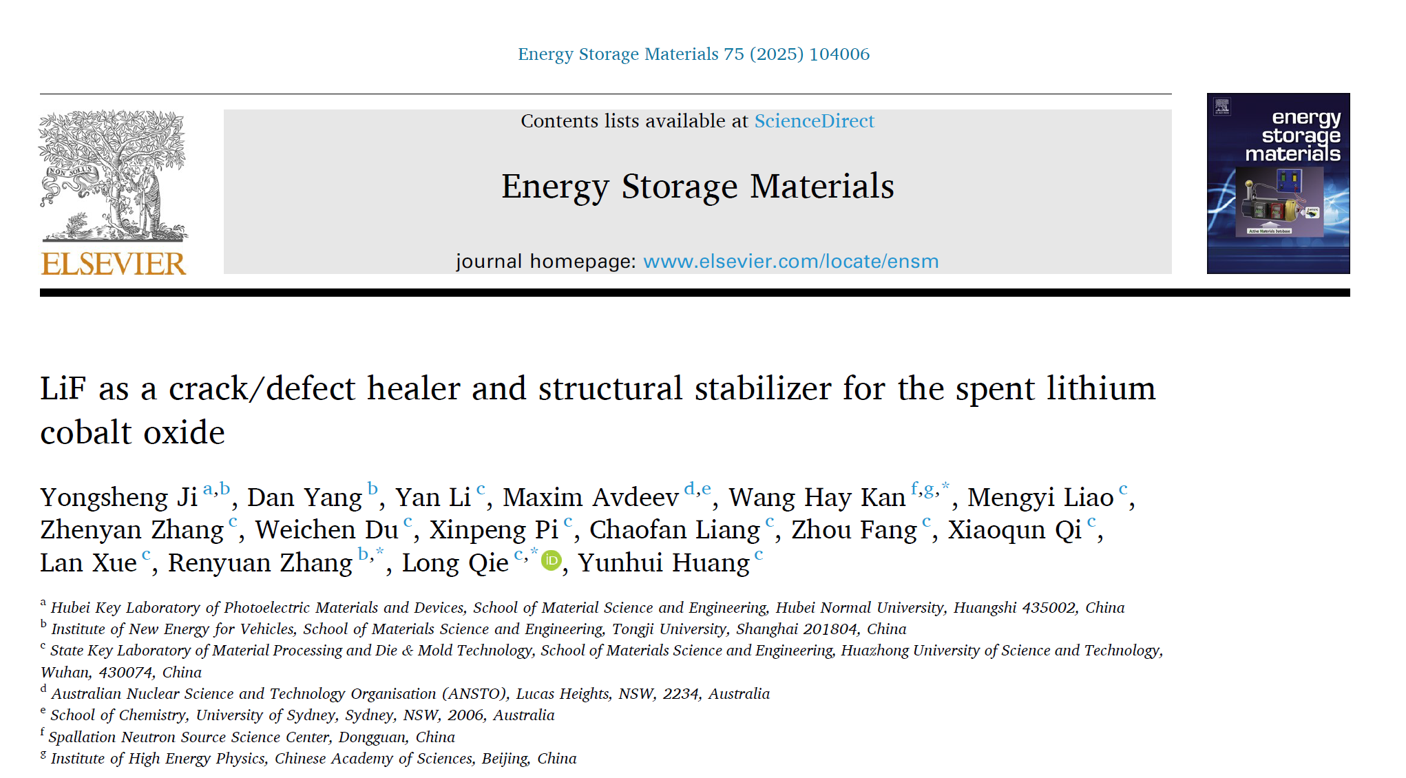 近日,材料学院纪永生博士团队在锂离子电池回收与材料再生方向取得重要研究进展,相关成果以题为“LiF as a Crack/Defect Healer and Structural Stabilizer for the Spent Lithium Cobalt Oxide”的研究论文发表在国际权威期刊《Energy Storage Materials》(中科院一区TOP期刊,最新影响因子18.9)。该研究对退役锂离子电池正极材料的绿色高值化再生提出了全新思路,为实现电池资源循环利用与环境友好型回收工艺提供了重要理论与实践支撑。