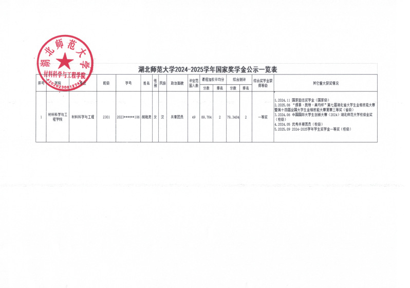太阳成集团tyc334552024-2025学年本科生国家奖学金评审结果公示