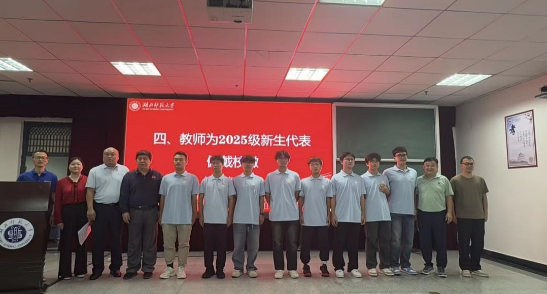 在全场瞩目下,教师代表为2025级新生代表佩戴校徽。当校徽稳稳别在新生胸前时,标志着一群新湖师人正式融入材料学院大家庭,即将开启他们的大学新征程。
