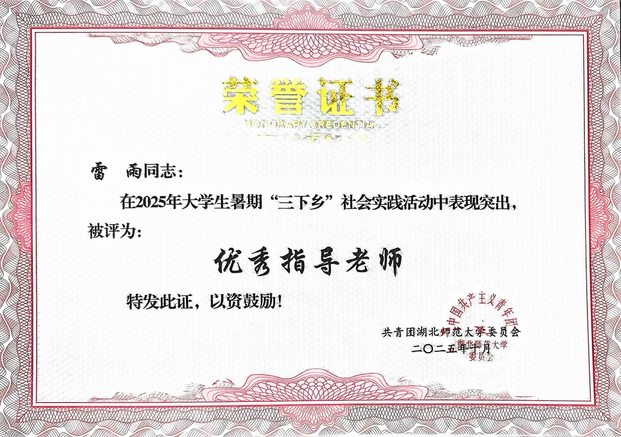 雷雨老师获2025年暑期社会实践优秀指导老师