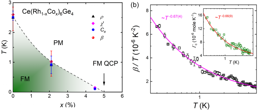 成果二:量子相变是当前凝聚态物理研究的一个前沿问题,与非常规超导和新奇物态的调控紧密相关,在量子计算、信息存储等领域具有重要价值。本研究在先前CeRh6Ge4中铁磁量子临界点的发现【沈斌*、张勇军*、袁辉球教授等人,Nature 579, 51-55 (2020)】的研究基础上,进一步通过助熔法生长了Co/Rh替换的CeRh6Ge4高质量单晶,发现了由Co/Rh掺杂诱导且不受无序效应影响的铁磁量子临界点,为在压力下无法实现的铁磁量子临界标定行为以及物理属性研究提供了途径。同时,通过对在Co掺杂的量子临界点附近的高精度热膨胀和比热测量,我们发现其热膨胀系数和格利艾森常数(Γ)在趋近于绝对零度时呈现出随温度指数发散的行为,其中Γ= T -2/3,具有z = 3的动力学涨落因子,这表明该体系中的量子涨落可能牵涉自旋之外的其它自由度(例如电荷涨落等)。相关研究工作为揭示铁磁量子临界的标度行为和物理属性、发展量子相变理论提供了实验依据,该成果以“Critical Fluctuations and Conserved Dynamics in a Strange Ferromagnetic Metal”为题发表在2025年12月的Physical Review Letter上,其中展进和张勇军博士为论文共同第一作者,浙江大学袁辉球教授、Michael Smidman研究员以及罗格斯大学/伦敦大学的 Piers Coleman 教授为共同通讯作者。